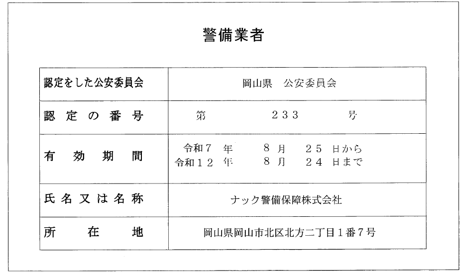 ナック警備保障株式会社は、岡山市を拠点に県内全域で警備サービスを展開しています。私たちは「NAC=No Accident Creators」を理念に掲げ、事故ゼロの現場を創り出すことを使命としています。単なる警備にとどまらず、地域の安心と信頼を築く安全のクリエイターとして、信頼される警備サービスを通じて安心の輪を広げていきます。